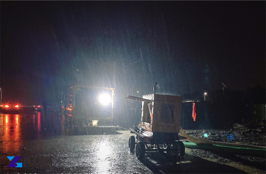 安裝調(diào)試一直持續(xù)到晚上,遭遇暴雨來襲,豫工技術(shù)員堅守一線,與抗洪人員一道,全力以赴,通宵奮戰(zhàn),保證5臺防汛泵車全部投入工作,第一時間開始執(zhí)行防汛吸水任務(wù)!